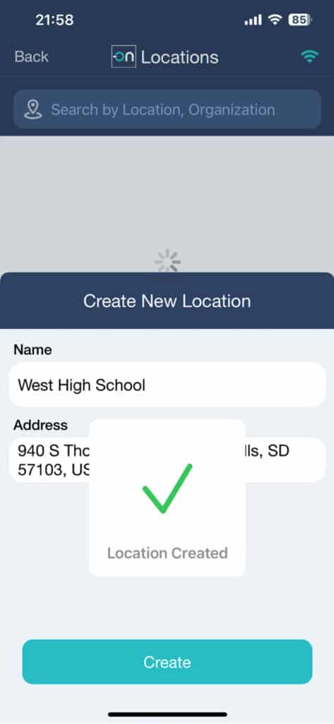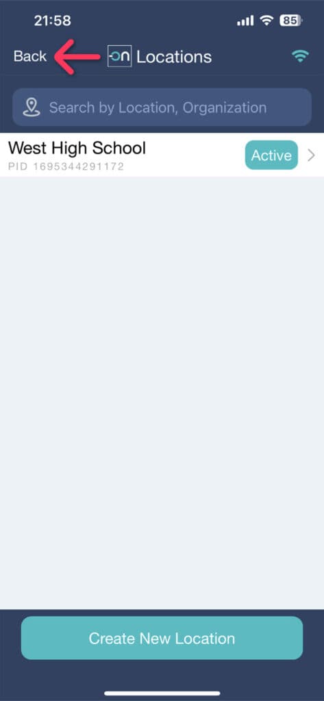 Once created, the location will appear in the Locations list. Press the Back button on the upper left corner.