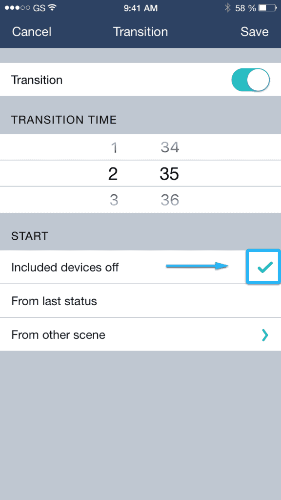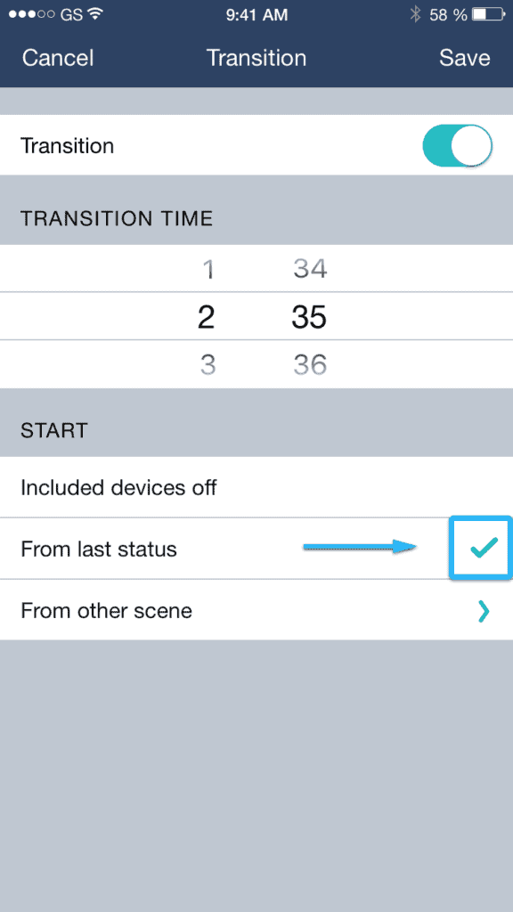 Transitions create a smooth migration during a scene from one set of color and intensity settings to another over a given period of time. Adding transitions creates a more customized and intelligent Avi-on experience. You may set your scene to transition from one already programmed scene to another, from the previous status of your selected devices to the current scene, or from the off state to the current scene you are programming.